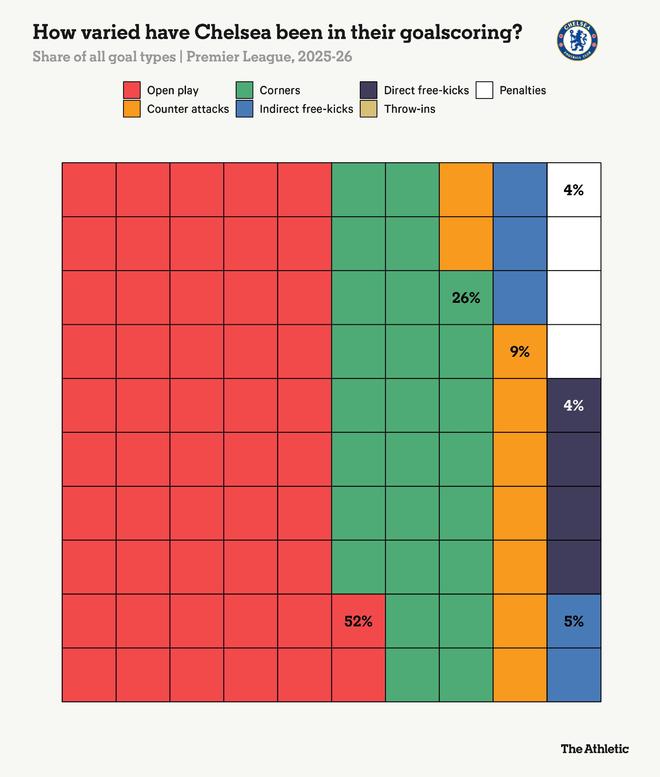 近日,The Athletic 发表了专题文章,分析了本赛季切尔西的表现以及进球数量,表示蓝军本赛季虽无进球超4球的高产射手,却凭借极为分散的进球分布,展现出独特的进攻火力特点,以下为专题文章。