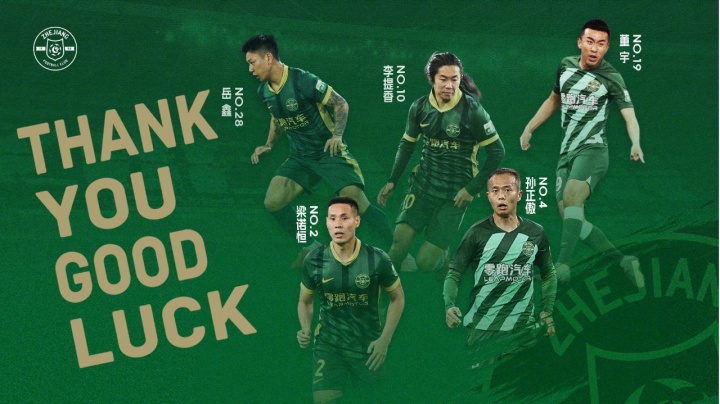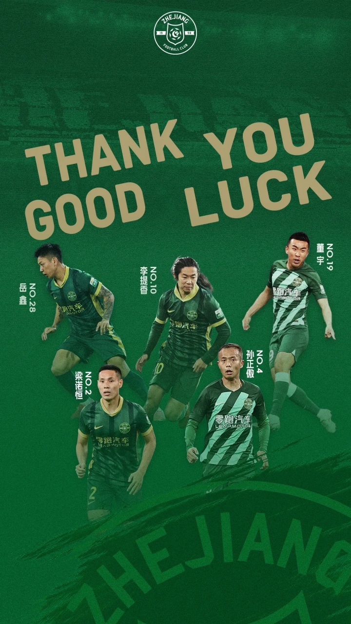 山高水长,终有一别。感谢五位球员在过去的岁月里为浙江FC留下和创造的一切,你们的梦想曾在这里生长,我们的历史也因你们而闪亮。难说再见,衷心祝福李提香、孙正傲、董宇、岳鑫、梁诺恒在未来的职业生涯和生活中一切顺利,也欢迎你们常回家看看。